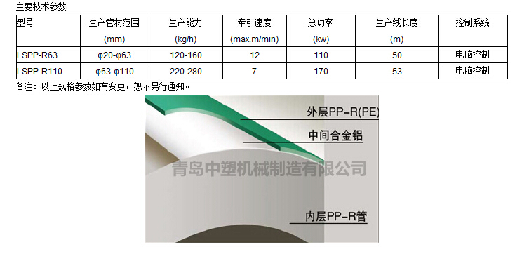 生產(chǎn)線由PP-R 內(nèi)管成型 鋁箔成型,涂膠、外覆擠出等部分組成。穩(wěn)態(tài)PP-R管與普通PP-R 管相比,除保持純PP-R 塑料管材耐高溫,聯(lián)接方便等特點外。具有熱膨脹系數(shù)小( 為純PP-R 管材的1/3),耐壓強度高,抗紫外線,低溫抗沖擊性能好等特點, 大大拓寬了普通PP-R 管道的應(yīng)用范圍。該生產(chǎn)線不但可以生產(chǎn)穩(wěn)態(tài)PP-R 管材,還可以生產(chǎn)普通PP-R 管材。